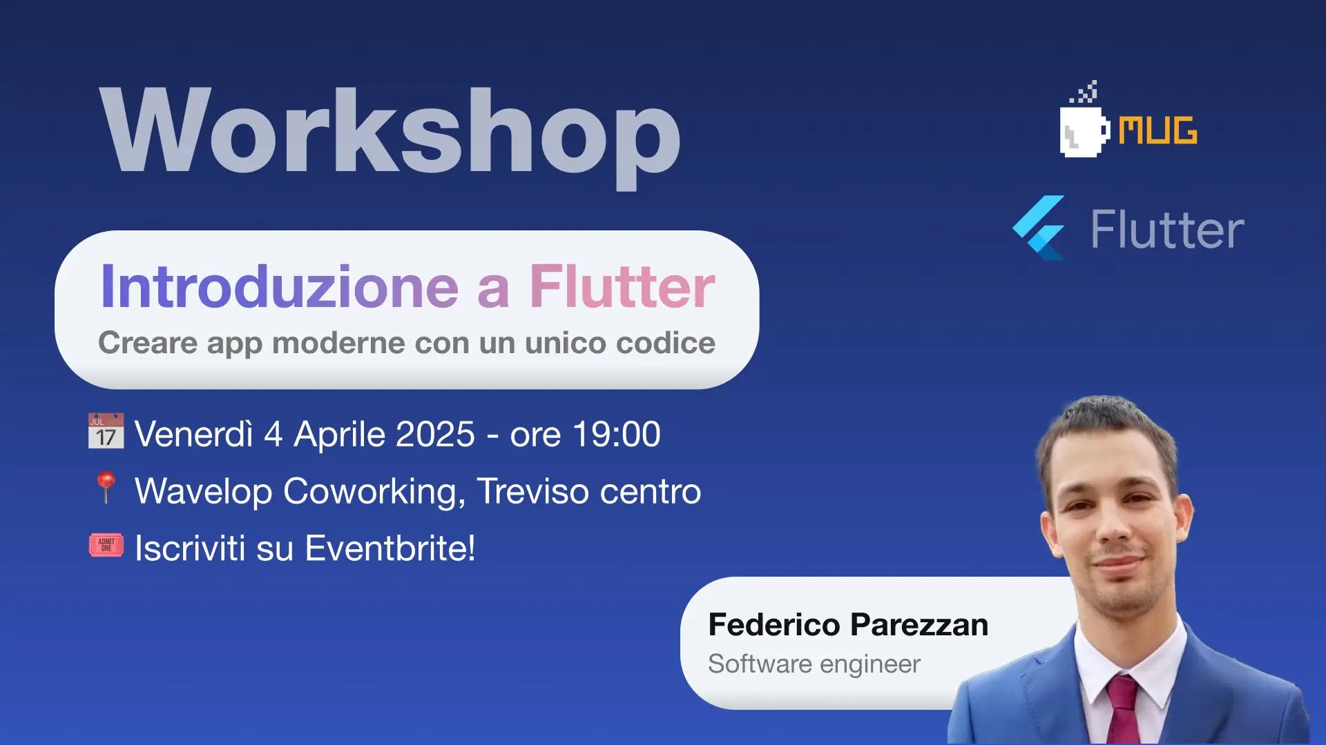 Questo mese il MUG propone un mini workshop su Flutter con un nuovo speaker: Federico Parezzan.